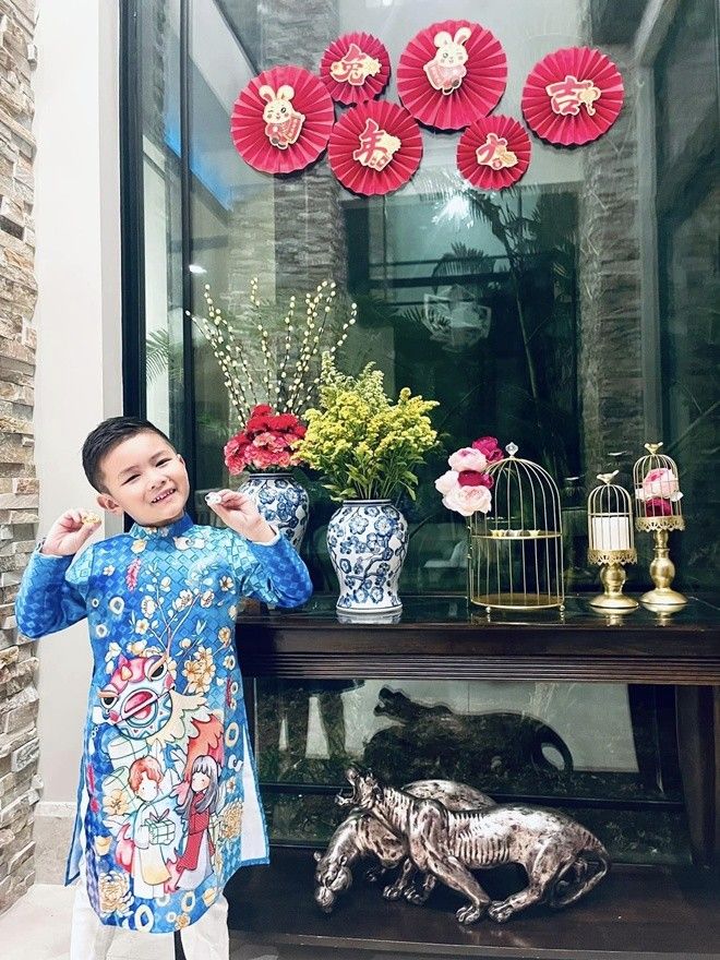 Trên trang cá nhân, vợ cũ Đan Trường thường xuyên đăng tải hình ảnh, video về cậu quý tử nhà mình. Mới đây, doanh nhân Thủy Tiên tiếp tục khoe ảnh bên cạnh con trai Thiên Từ nhân dịp Tết Quý Mão. Trong ảnh, Thiên Từ được mẹ phối cho chiếc áo hiệu màu vàng cùng quần kaki màu xám, kèm theo đó là chiếc kính cùng màu áo khiến cậu bé ngầu và đẹp trai như mẫu nhí.