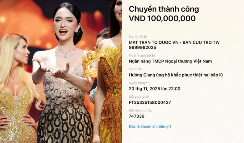 Trong lúc tất bật chuẩn bị cho vòng chung kết Miss Universe, hoa hậu Hương Giang vẫn không quên hướng về quê hương, kịp thời chuyển tiền ủng hộ đồng bào đang chịu ảnh hưởng nặng nề của bão lũ. Trên trang cá nhân, cô chia sẻ: “Vừa kịp xong xuôi hết mọi việc tại khách sạn, thấy tin tức ở Việt Nam tôi lại tiếp tục mưa lũ lịch sử. Thương quá Việt Nam ơi cầu mong mọi thứ sớm đi qua. Hương Giang xin góp một phần nhỏ bé của mình để hỗ trợ mọi người vượt qua giai đoạn khó khăn này ạ!”.