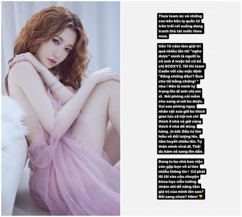Trên trang cá nhân, Elly Trần lại gây chú ý khi tỏ thái độ bức xúc trước những thông tin sai lệch về bản thân nhiều năm qua. Theo đó, bà mẹ 2 con viết: "Thưa team ác và những con kền kền lạ quắc từ trên trời rơi xuống đang tranh thủ tát nước theo mưa. Gần 15 năm làm giải trí quá nhiều lần tôi nghe được mình là người yêu cũ anh A hoặc bồ cũ bồ chị BCDXYZ. Tôi thì team Cadie với câu mặc định ''Bằng chứng đâu? Đưa cho tôi bằng chứng!" nha. Nên là mình tự trọng lên đi anh chị em ơi. Nói phóng cái mồm cho sang ai nói không được.