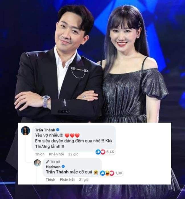 Sau khi thay chồng nhận giải tại Liên Hoan Phim Châu Á Đà Nẵng, Hari Won liền xúc động đăng tải lời chúc mừng Trấn Thành trên trang cá nhân. Dưới bài viết của vợ, Trấn Thành để lại lời khen cho màn phát biểu của bà xã: "Yêu vợ nhiều! Em siêu duyên dáng đêm qua nhé! Kakaka. Thương lắm!". Hari Won liền đáp lại ngay và luôn: "Mắc cỡ quá".