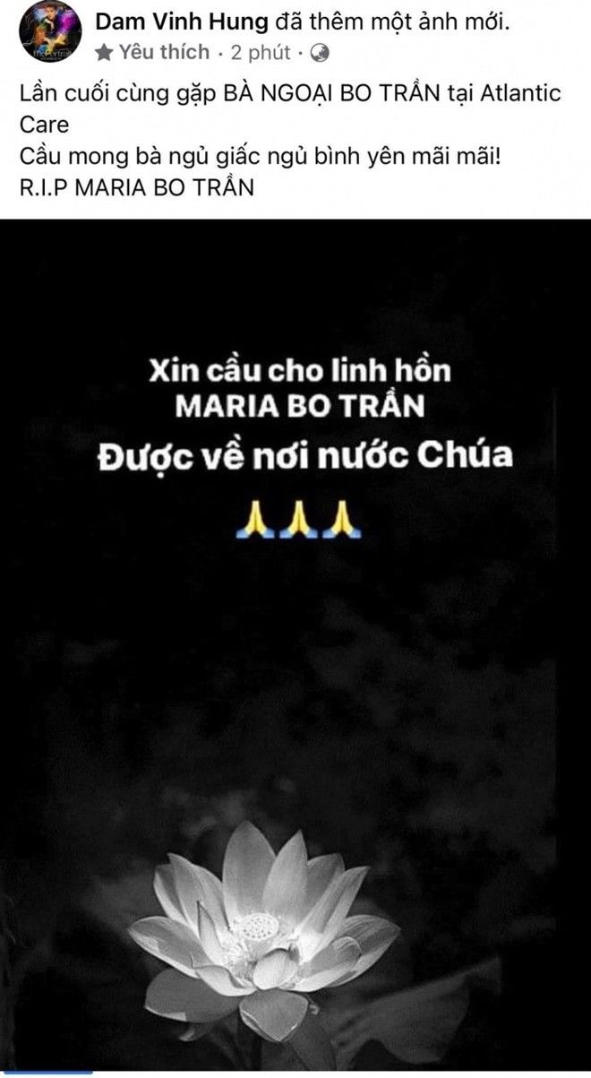 Ngoài ra, trên trang cá nhân, nam ca sĩ cũng đăng chia sẻ tiếc thương mẹ vợ cũ. Mr. Đàm viết: "Lần cuối cùng gặp bà ngoại Bo Trần tại Atlantic Care. Cầu mong bà ngủ giấc ngủ bình yên mãi mãi!".