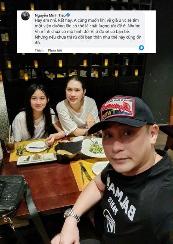 Dưới bài đăng, nam diễn viên Minh Tiệp ngay lập tức đồng tình. Anh còn cho biết về già chỉ mong cùng vợ sống trong viện dưỡng lão: "Hay em nhỉ. Rất hay. Anh cũng muốn khi về già 2 vợ chồng sẽ tìm một viện dưỡng lão có thể là chất lượng tốt để ở. Nhưng Việt Nam mình chưa có mô hình đó. Vì ở đó sẽ có bạn bè. Nhưng nếu chưa thì rủ đội bạn thân như thế này cũng ổn đó".