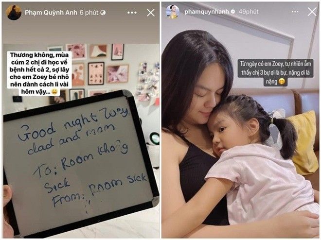 Mới đây, Phạm Quỳnh Anh có chia sẻ gây chú ý trên Facebook. Theo đó, nữ ca sĩ xúc động khoe lời nhắn từ 2 con gái đầu với nội dung chúc ngủ ngon, cho biết vì đang ốm sẽ nên ở phòng khác. Cô viết: "Thương không, mùa cúm 2 chị đi học về bệnh hết cả 2. Sợ lây cho em Zoey bé nhỏ nên đành cách ly vài hôm vậy".