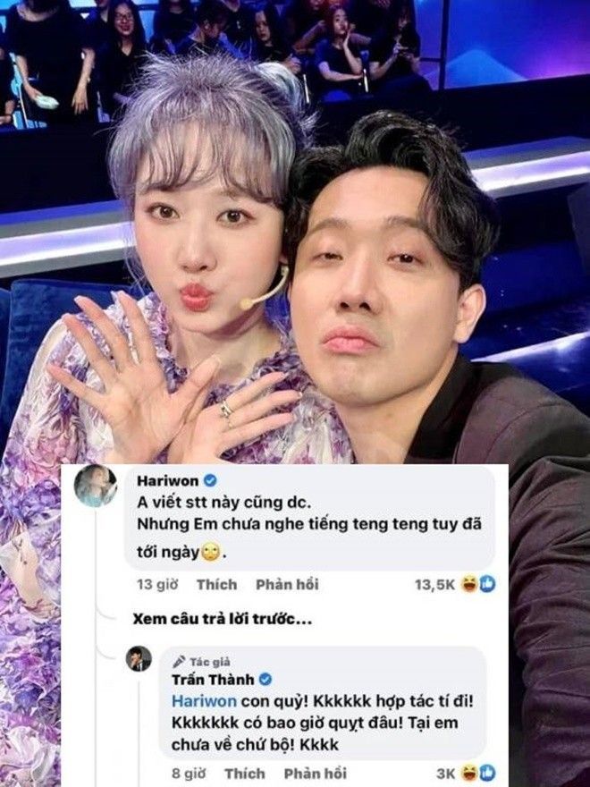 Dưới bài viết, Hari Won bất ngờ để lại bình luận "bóc phốt" ông xã: "Anh viết status này cũng được nhưng em chưa nghe tiếng teng teng tuy đã tới ngày". Lúc này, Trấn Thành liền lên tiếng chống chế: "Con quỷ, hợp tác tí đi, có bao giờ quỵt đâu! Tại em chưa về chứ bộ".