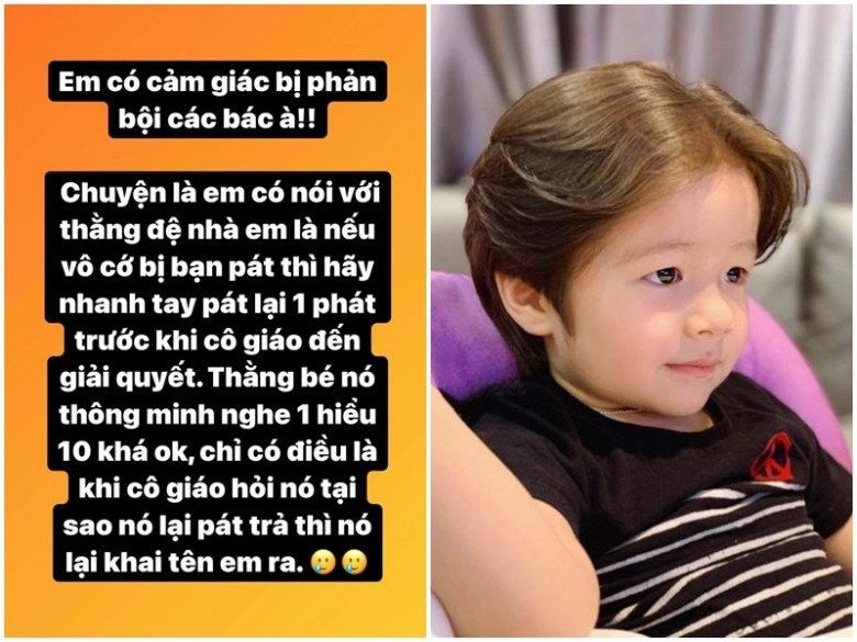 Cụ thể, người đẹp 8X kể: "Em có cảm giác bị phản bội các bác à. Chuyện là em có nói với thằng đệ nhà em, là nếu vô cớ bị bạn phát thì hãy nhanh tay phát lại một phát trước khi cô giáo đến giải quyết. Thằng bé nó thông minh nghe một hiểu mười, chỉ có điều khi cô giáo hỏi lại nó tại sao lại phát trả, nó lại khai tên em ra".