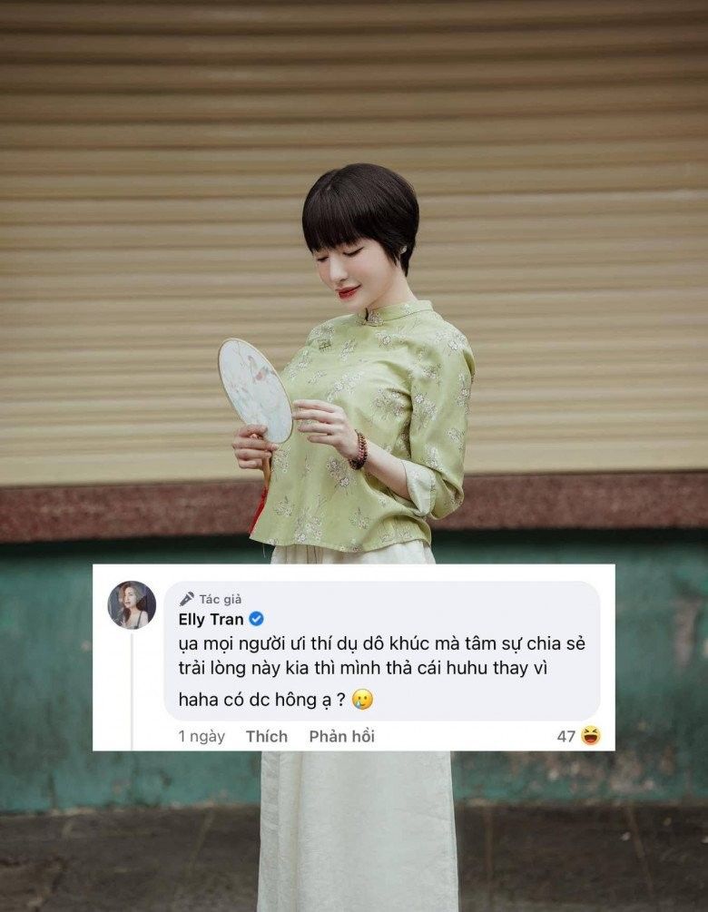 Chia sẻ của Elly Trần nhận về lượng lớn biểu cảm "Haha". Cư dân mạng thích thú, để lại loạt bình luận bông đùa dưới câu chuyện của nữ diễn viên. Cách dạy con của "mẹ bỉm 2 con" cũng được nhiều người đồng tình. Trước làn sóng hưởng ứng của khán giả, Elly Trần "bó tay" viết: "Ủa mọi người ơi, thí dụ vô khúc mà tâm sự, chia sẻ, trải lòng này kia thì mình thả cái 'huhu' thay vì 'haha' có được không ạ?".