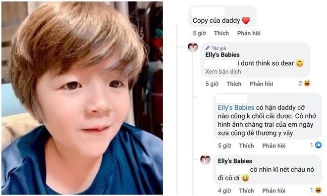 Theo đó, một vị khán giả bình luận: “Copy của daddy”, Elly liền đáp “Tôi không nghĩ vậy”. Thấy vậy, vị này liền tiếp tục chứng minh sự giống nhau: “Có hận daddy cỡ nào cũng không chối cãi được. Cô nhớ hình ảnh chàng trai của em ngày xưa cũng dễ thương y vậy”. Không muốn gây tranh cãi, Elly chỉ nhẹ nhàng nhắc nhở người này: “Cô nhìn kỹ nét cháu nó đi cô ơi”.