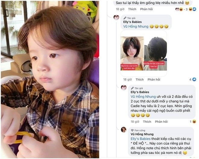 Để chứng minh, người đẹp còn đăng tải hình ảnh khi mình tóc ngắn để ghép với Alfie. Ngoài ra, cô còn giải thích thêm tại sao lại nói 2 chị em Alfie và Cadie giống mẹ: “Với cả 2 đứa đều có 2 cục thịt dư dưới môi y chang tui mà Cadie hay kêu là 2 cục kẹo. Nhìn giống nhau mấy cái ngộ ngộ buồn cười phết”. Cô cười khi fan cho rằng mình thoát kiếp "đẻ hộ".