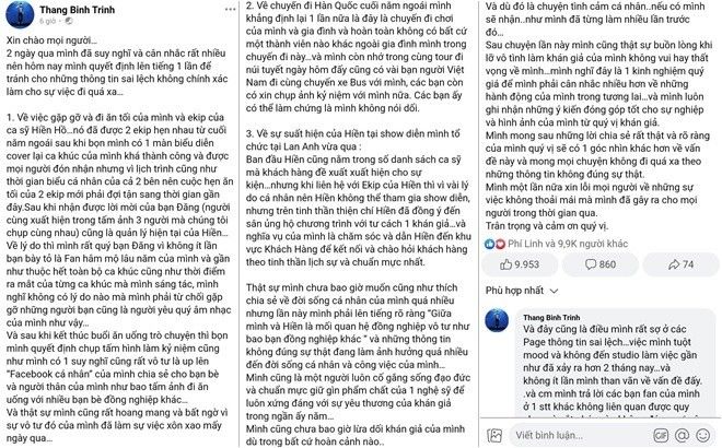 Sau khi gánh hậu quả vì liên tục bị tụt follow khi đăng ảnh thân thiết đi ăn cùng Hiền Hồ, đồng thời bị hủy đêm diễn cùng sự quay lưng của khán giả, Trịnh Thăng Bình vừa chính thức lên tiếng. Anh giải thích lý do mình và Hiền Hồ đi ăn tối cùng nhau xuất phát từ việc ekip của cả hai hẹn lịch gặp gỡ sau thành công của một dự án vào năm ngoái, quản lý của Hiền Hồ cũng là fan lâu năm của anh.