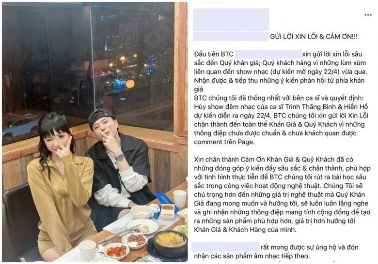 Tiếp thu và tiếp thu những phản hồi từ dư luận, BTC chúng ta đã thống nhất với các ca sĩ và quyết định: Hủy bỏ đêm nhạc của ca sĩ Trịnh Thăng Bình và Hiền Hồ dự kiến diễn ra vào ngày 22/4. Chúng tôi xin chân thành xin lỗi quý công chúng và quý khách hàng về những bình luận thiếu chuẩn mực và không khách quan trên trang.