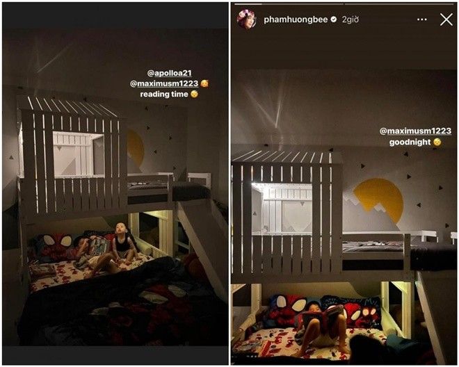 Có thể thấy, dù đang sống trong 1 căn biệt thự rộng rãi nhưng Phạm Hương vẫn cho 2 con ngủ nghỉ cùng nhau tại không gian ấm cúng thay vì mỗi nhóc tỳ có một căn phòng riêng.