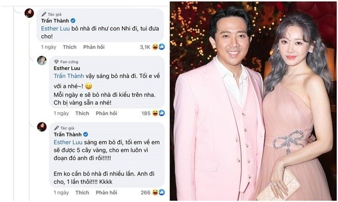 Đáng chú ý, Hari Won thấy vậy cũng ngay lập tức vào bình luận xin xỏ. Cô viết "Anh đưa em với", kèm biểu tượng chìa tay xin tiền. Đáp lại, nam MC trả lời vợ: "Bỏ nhà đi như con Nhi đi, tui đưa cho!" Hari Won đáp: "Vậy sáng bỏ nhà đi. Tối em về với anh nhé! Mỗi ngày em sẽ bỏ nhà đi kiểu trên nha! Chuẩn bị vàng sẵn anh nhé".