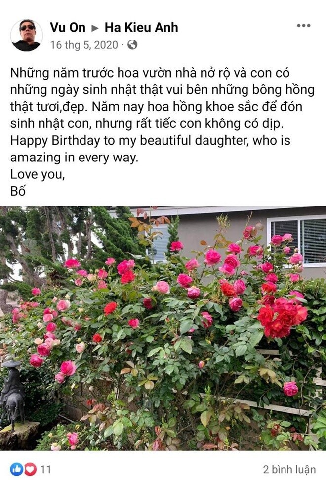Có thể thấy, Hoa hậu Hà Kiều Anh có mối quan hệ thân thiết với ông Vu On, gọi là "bố" vô cùng gần gũi. Dưới bài viết, rất nhiều bạn bè đã vào gửi lời chúc mừng tới bố dượng nàng hậu. Diva Hồng Nhung viết: "Kính chúc chú On sức khỏe và nhiều niềm vui ạ! Happy birthday chú!".