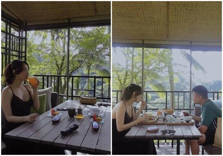 Đồng thời, nữ ca sĩ cũng chia sẻ thêm về cuộc sống hôn nhân và tiết lộ 2 vợ chồng hiếm khi ngồi ăn sáng cùng nhau vì lệch giờ làm việc: "Chỉ khi đi du lịch thì ông chồng của tui mới được ngồi ăn sáng với tui kiểu này thôi. Vợ nghệ sĩ, chồng văn phòng là vậy đó. Vì đang bầu bí nên đi du lịch chủ yếu là nghỉ dưỡng chứ không phải đi phượt như hồi xưa lúc còn mới yêu, hay lúc còn trẻ. Nên ưu tiên hàng đầu của 2 vợ chồng là lựa chọn resort có không gian thoáng đãng và gần gũi với thiên nhiên".