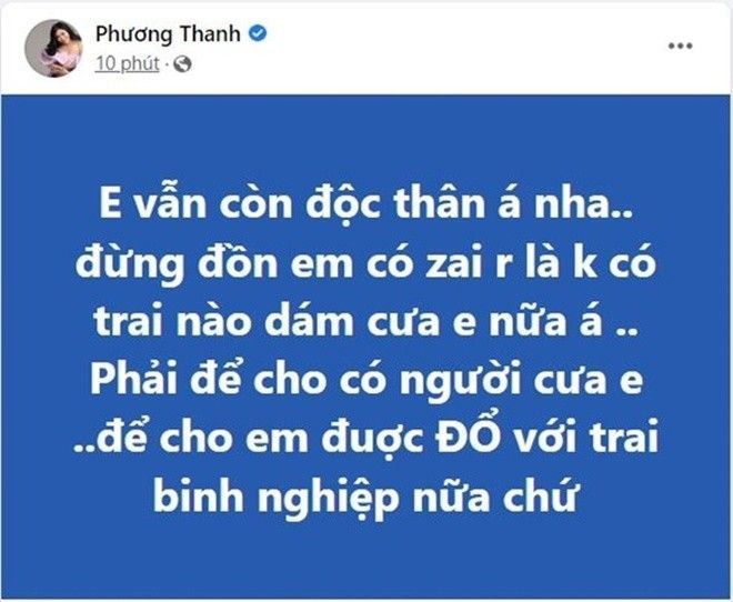 Mới đây, trên trang cá nhân, Phương Thanh đăng tải bài viết tiết lộ tình trạng quan hệ hiện tại sau thời gian bị đồn hẹn hò tình trẻ kém 20 tuổi. Cụ thể, "chị Chanh" nhấn mạnh mình vẫn còn độc thân và chia sẻ: "Em vẫn còn độc thân á nha, đừng đồn em có trai rồi là không có trai nào dám cưa em nữa á. Phải để cho có người cưa em, để cho em được đổ với trai binh nghiệp nữa chứ".