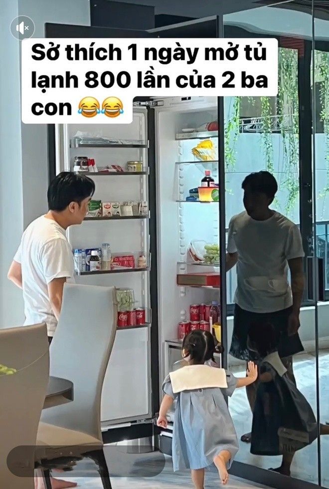 Mới đây, Đàm Thu Trang khoe khoảnh khắc đáng yêu của chồng và con gái. Theo đó, cựu người mẫu tiết lộ sở thích đặc biệt của 2 bố con là "ngày mở tủ lạnh 800 lần". Trong ảnh, Cường Đô La và Suchin đều đang chăm chú tìm kiếm món đồ yêu thích của mình.