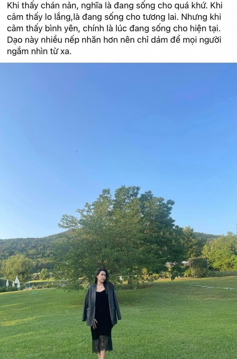 Trước đó, vợ Hồ Hoài Anh cũng từng có bài viết về sự bình yên: "Khi thấy chán nản, nghĩa là đang sống cho quá khứ. Khi cảm thấy lo lắng, là đang sống cho tương lai. Nhưng khi cảm thấy bình yên, chính là lúc đang sống cho hiện tại. Dạo này nhiều nếp nhăn hơn nên chỉ dám để mọi người ngắm nhìn từ xa".
