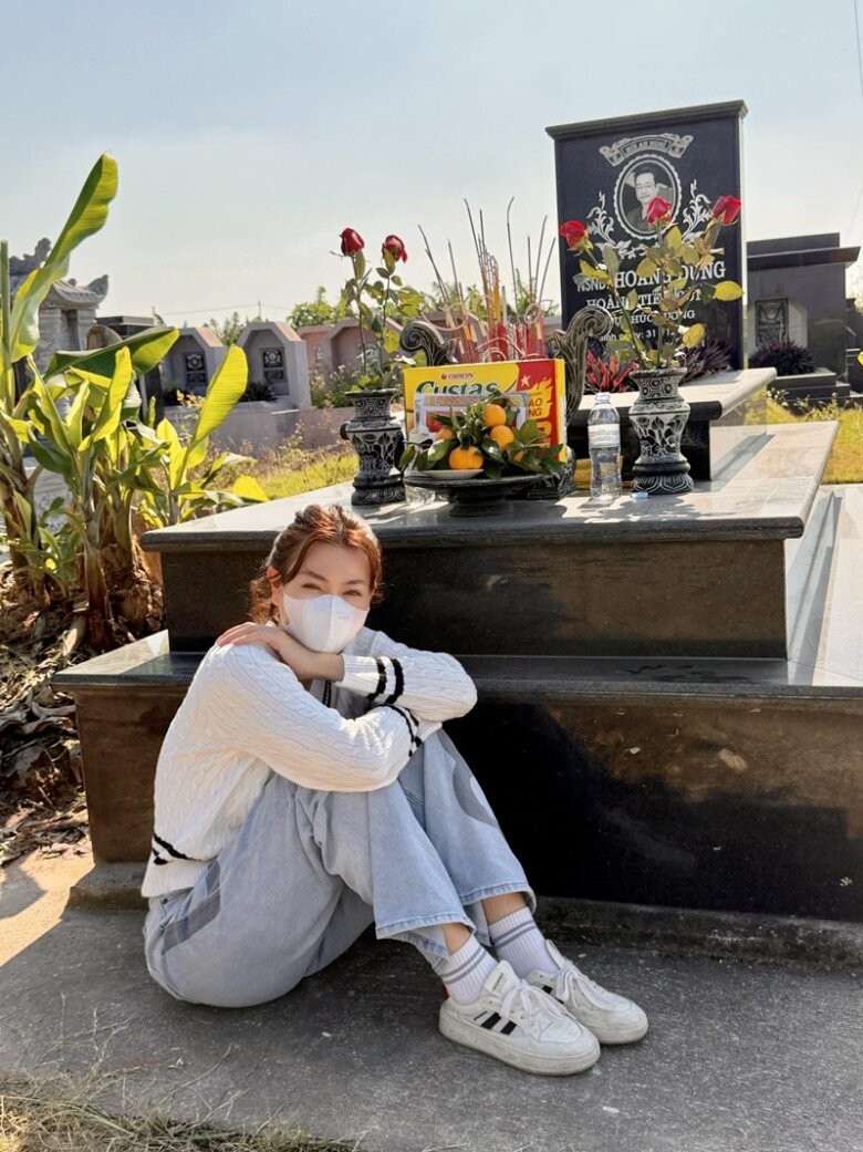 Diễn viên Thanh Hương đến thăm mộ NSND Hoàng Dũng kèm chia sẻ: “Ngồi đây ông che nắng cho nhé”.