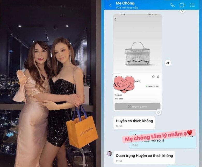Trong đoạn trò chuyện, mẹ chồng Huyền Baby gửi hình chiếc túi xách hàng hiệu giá trị và hỏi con dâu: "Huyền có thích không". Ngay sau đó, bà còn nhấn mạnh: "Quan trọng là Huyền có thích không", thể hiện sự tinh tế và yêu thương dành cho con dâu. Chỉ qua vài dòng tin nhắn ngắn gọn, dân tình đã phần nào cảm nhận được mối quan hệ vô cùng hòa thuận, gần gũi giữa 2 người.