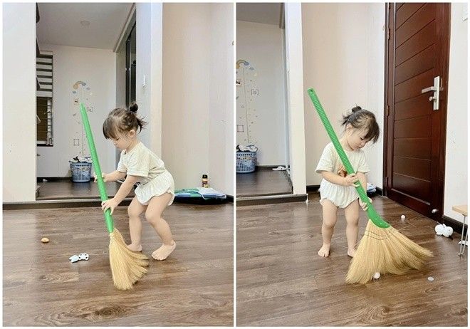 Mới đây trên trang cá nhân của con gái, Đông Nhi vừa đăng tải loạt ảnh mới nhất gây chú ý. Trong ảnh, Winnie hóa thân thành cô gái đảm, đang chăm chỉ dọn dẹp nhà. Dù động tác cầm chổi còn chưa chuyên nghiệp nhưng đủ thấy cô bé chăm chỉ cỡ nào.