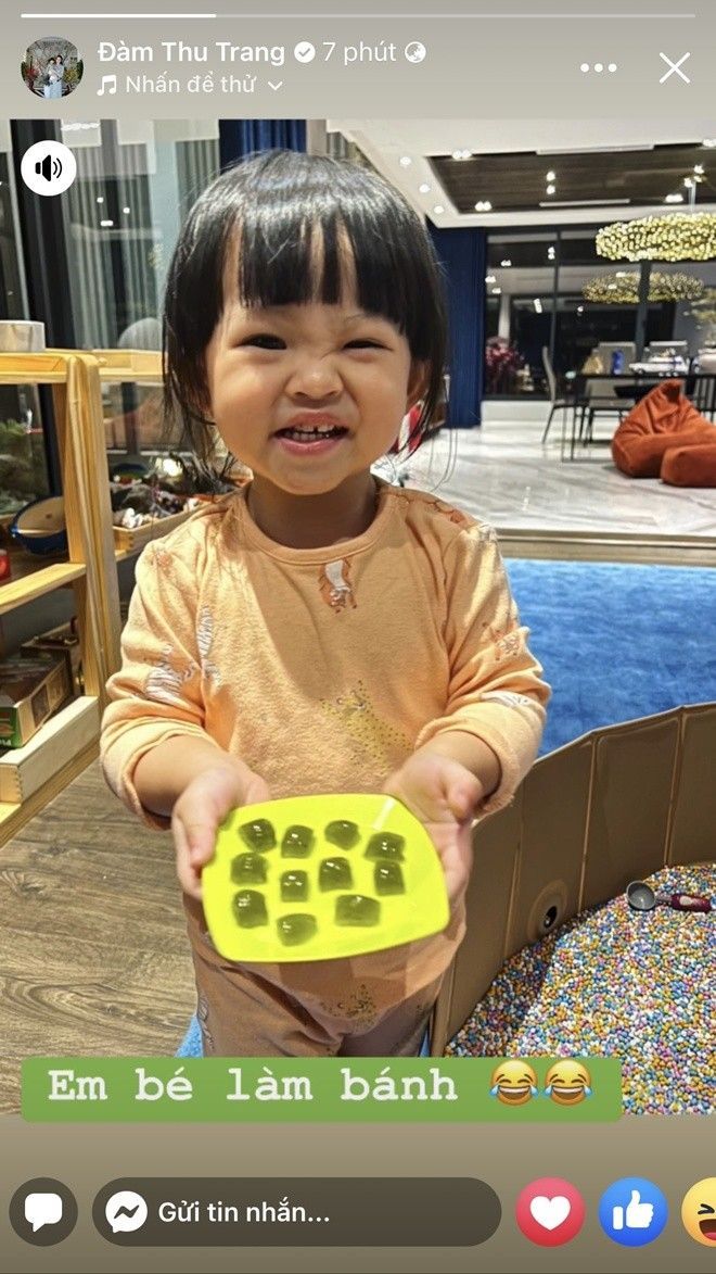 Trên trang cá nhân của mình, Đàm Thu Trang vừa khỏe ảnh ái nữ học làm bánh lần đầu tiên. Trong ảnh được mẹ chụp lại, trông Suchin có phần bị “dìm hàng” nhưng nhìn cô bé tay cầm thành quả, nở nụ cười tươi rói vẫn khiến mọi người “muốn xỉu” vì quá đỗi dễ thương. Ái nữ nhà Cường Đô La không những đáng yêu mà còn rất đảm việc nhà. Từ làm bánh đến quét dọn nhà cửa, không việc gì làm khó được Suchin.