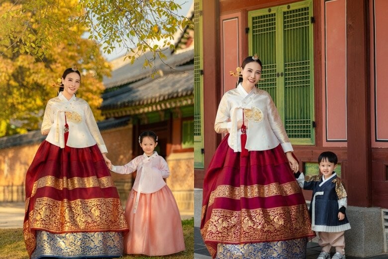Trên trang cá nhân, Đàm Thu Trang khoe ảnh cùng 2 nhóc tì Suchin và Sutin diện Hanbok khám phá mùa thu xứ kim chi. Kèm theo loạt ảnh đẹp, cô chia sẻ dòng trạng thái hạnh phúc: “Giữa sắc vàng mùa thu…mẹ có hai chiếc lá nhỏ ôm lấy mình”.