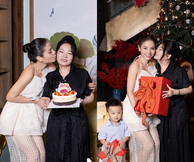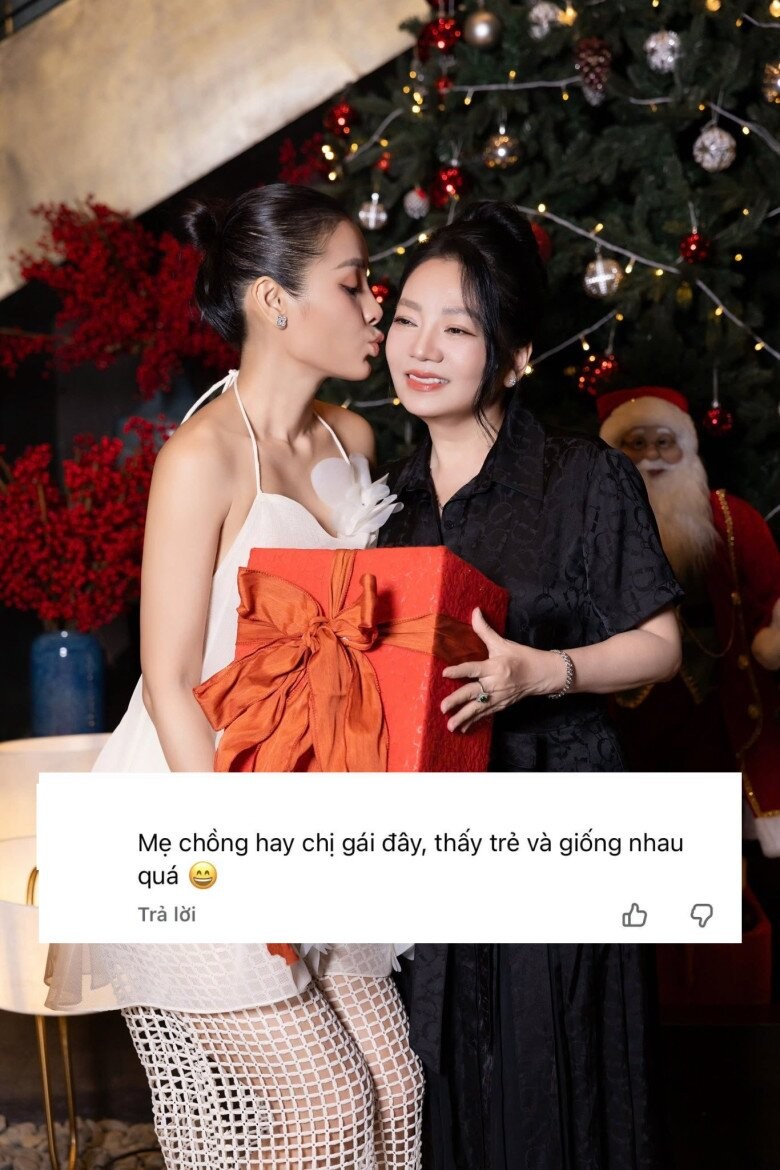 Trong loạt ảnh được chia sẻ, mẹ chồng Phương Trinh Jolie gây chú ý bởi vẻ ngoài trẻ trung, rạng rỡ, thậm chí nhiều cư dân mạng nhận xét nhìn chẳng khác gì chị gái khi đứng cạnh con dâu. Cặp mẹ chồng – nàng dâu còn liên tục có những khoảnh khắc vô cùng thân thiết như ôm nhau, hôn má và mỉm cười đầy hạnh phúc trong bữa tiệc sinh nhật ấm cúng.