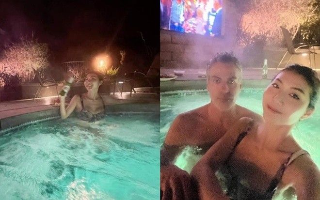 Trong ảnh, cô diện đồ bikini gợi cảm cùng khuôn mặt mộc không rạng rỡ đang tựa vai tình tứ vào bạn trai Tây trong bể bơi. Cả hai không ngại ngần trao nhau những cử chỉ thân mật ngọt ngào của đôi lứa đang yêu.