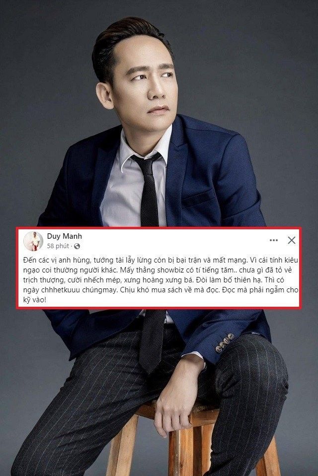 Mới đây trên trang cá nhân, Duy Mạnh gây chú ý khi đăng tải bài viết châm chọc một bộ phận "nghệ sĩ bẩn" trong showbiz Việt. Cụ thể, nam ca sĩ gốc Hải Phòng gay gắt lên án: "Đến các vị anh hùng, tướng tài lẫy lừng còn bị bại trận và mất mạng vì cái tính kiêu ngạo, coi thường người khác. Mấy thằng showbiz có tí tiếng tăm chưa gì đã tỏ vẻ trịch thượng, cười nhếch mép, xưng hoàng xưng bá. Đòi làm bố thiên hạ. Thì có ngày **** ** chúng mày. Chịu khó mua sách về mà đọc. Đọc mà phải ngẫm cho kỹ vào!"