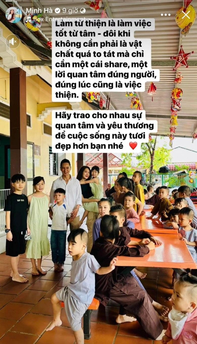 Mới đây trên story Facebook, vợ Lý Hải vừa đăng tải vợ chồng cô đi từ thiện cùng các con. Trong ảnh, cả gia đình Minh Hà ăn mặc giản dị, chụp cùng các em nhỏ mồ côi. Kèm theo hình ảnh đáng yêu, vợ Lý Hải viết: “Làm từ thiện là làm việc tốt từ tâm - đôi khi không không cần phải là vật chất quá to tát mà chỉ cần một cái share, một lời quan tâm đúng người, đúng lúc cũng là việc thiện. Hãy trao cho nhau sự quan tâm và yêu thương để cuộc sống này tốt đẹp hơn bạn nhé”.