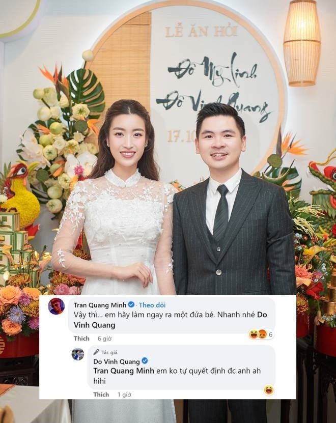 Sau sau kết hôn, Đỗ Mỹ Linh và chồng đại gia luôn bị khán giả và bạn bè quan tâm về chuyện bầu bí. Mới đây dưới một bài viết của mình, khi được MC Quang Minh nói về việc “sản xuất” một em bé đáng yêu. Đỗ Vinh Quang liền đáp lại, nghe là thấy yêu thương và tôn trọng cỡ nào. Cụ thể, chồng Đỗ Mỹ Linh trả lời: “Em không tự quyết định được anh ạ”.