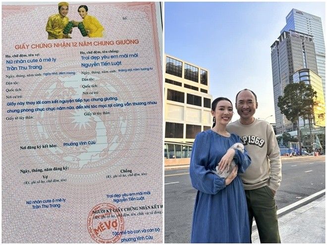 Diễn viên Tiến Luật gây chú ý khi đăng ảnh photoshop mừng kỷ niệm ngày cưới với vợ. Anh không quên "bóc phốt" Thu Trang một cách đáng yêu: "Hôm nay là kỷ niệm 12 năm ngày cưới, tức 12 năm chung giường (dù không ít lần cũng ra sofa, xuống gầm giường ngủ 1 mình). Mọi năm dù bận cỡ nào, tôi luôn tìm cách chạy về làm cho cô ấy bất ngờ.