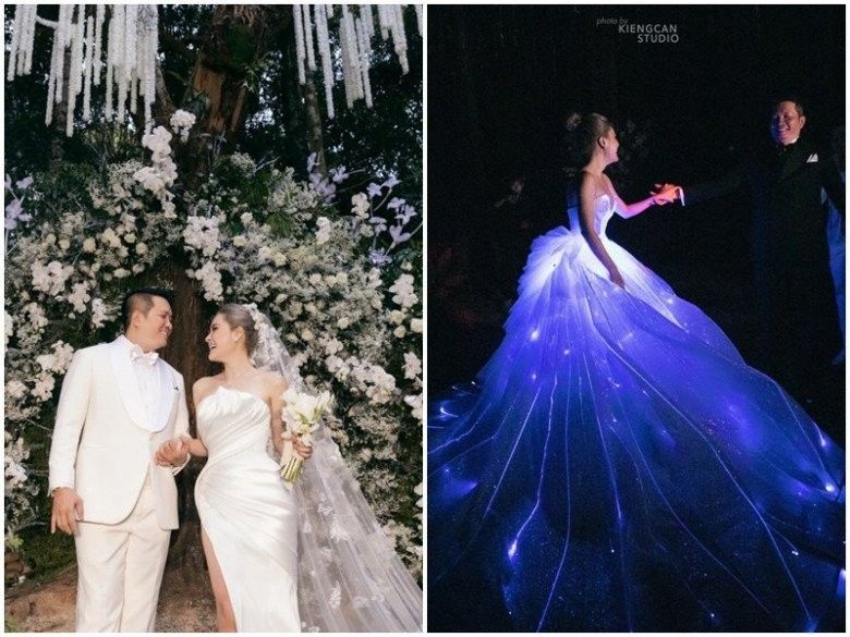 Ở buổi lễ chiều, cô dâu diện chiếc váy cưới thanh lịch bằng lụa Mikado, có nếp uốn xếp 3D lạ mắt với phần xẻ tà khoe dáng. Tại tiệc đêm trong khu rừng được trang trí ngập hoa, Di Băng thay chiếc váy bồng trắng lấp lánh với phần đuôi phồng tầng và cúp tim gợi cảm. Khi nữ ca sĩ cùng chồng tiến lên khu vực trung tâm - sân khấu toàn bộ đèn vụt tắt, và chiếc váy cưới bỗng phát sáng rực rỡ.