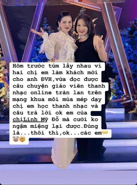 Cụ thể, Lệ Quyên cười "không ngậm được miệng" khi có người "dạy" Diva Mỹ Linh về thanh nhạc: "Hôm trước túm lấy nhau vì 2 chị em làm khách mời Đàm Vĩnh Hưng, vừa đọc được câu chuyện giáo viên thanh nhạc online tràn lan trên mạng. Khua môi múa mép dạy chị em học thanh nhạc và câu trả lời 'ok em' của chị Đỗ Mỹ Linh mà cười không ngậm miệng lại được. Đúng là... thôi thì ok các em".