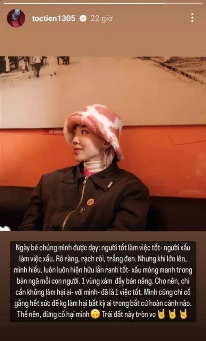 Vừa qua, trên trang cá nhân, Tóc Tiên bất ngờ ẩn ý nói có người "cố hại mình" khiến dân tình không khỏi hoang mang. Cụ thể, nữ ca sĩ viết: "Ngày bé chúng mình được dạy, người tốt làm việc tốt, người xấu làm việc xấu, rõ ràng, rạch ròi, trắng đen. Nhưng khi lớn lên mình hiểu, luôn luôn hiện hữu lằn ranh tốt - xấu trong bản ngã mỗi con người. Một vùng xám đầy bản năng.
