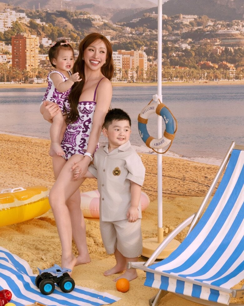 Trên trang cá nhân, vợ Chi Bảo vừa khoe loạt ảnh diện bikini đi biển cùng 2 con và tiết lộ 2 nhóc tì vô cùng hợp tác chụp ảnh: “Cuối tuần đi biển xả hơi nạp đầy pin thôi các cô ơi. Thích nhất là có con gái để mặc đồ đôi với mẹ nè. Các cô thấy Gia Khang và Gia Linh hợp tác nhịp nhàng với mẹ cháu chưa”.