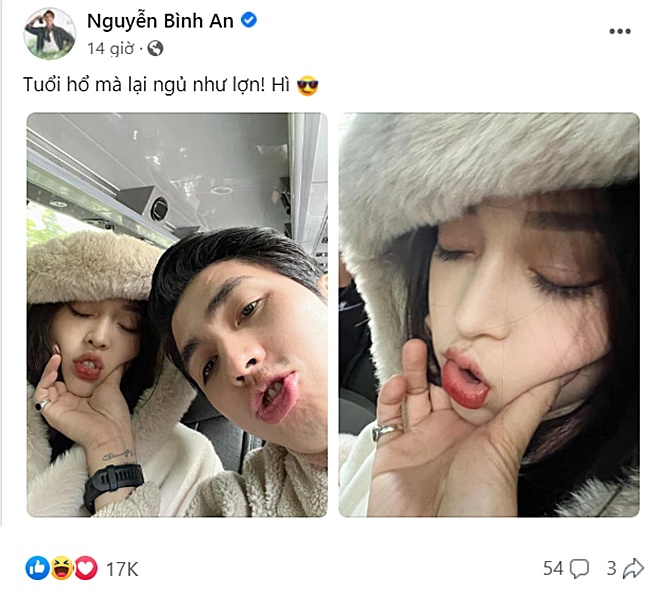 Trên trang cá nhân, Bình An vừa cập nhật ảnh "dìm hàng" vợ cho thấy cuộc sống vui vẻ, hài hước và trẻ trung bên bà xã sinh năm 1998.