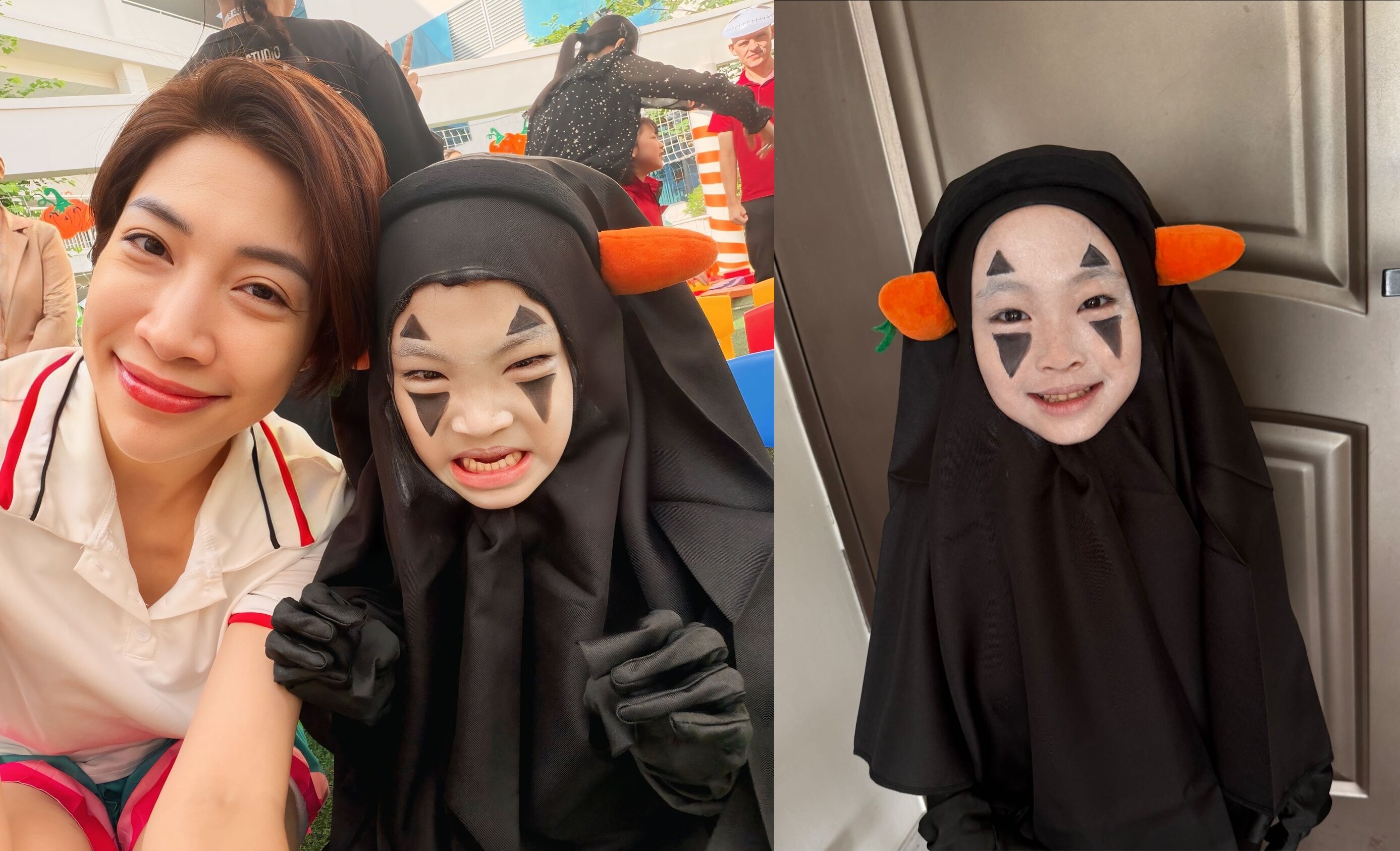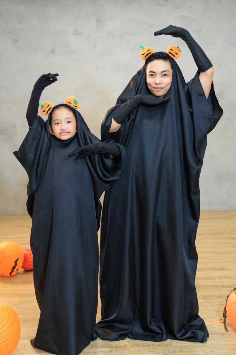Việt Hương chia sẻ: "Nay Halloween 2 má con em ghê chưa. Con gái có chủ đề giống phim gì á, còn em có 2 nhện gắn vô cho ghê ghê thôi, chưa có chủ đề cả nhà ghi dùm vô nha".