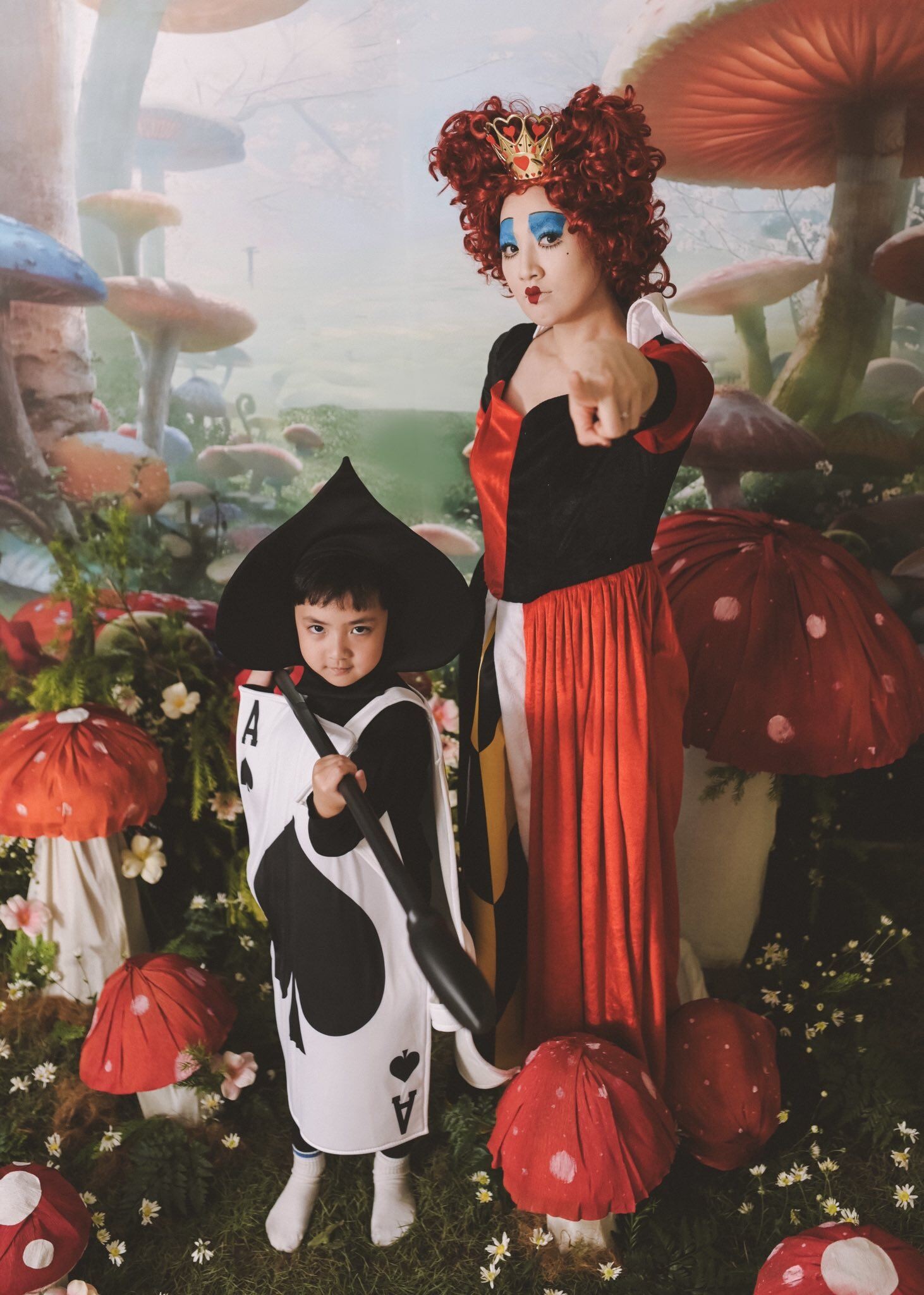 Á hậu Tú Anh cùng con trai hóa trang thành nhân vật trong "Alice xứ sở thần tiên". Nàng hậu chia sẻ: "Dự là đội quân này có 3 người mà trùm cuối bị ốm nên bà queen này còn mỗi quân A nên thôi mời mọi người ngắm tạm, năm sau 3 mẹ con tui làm lại".