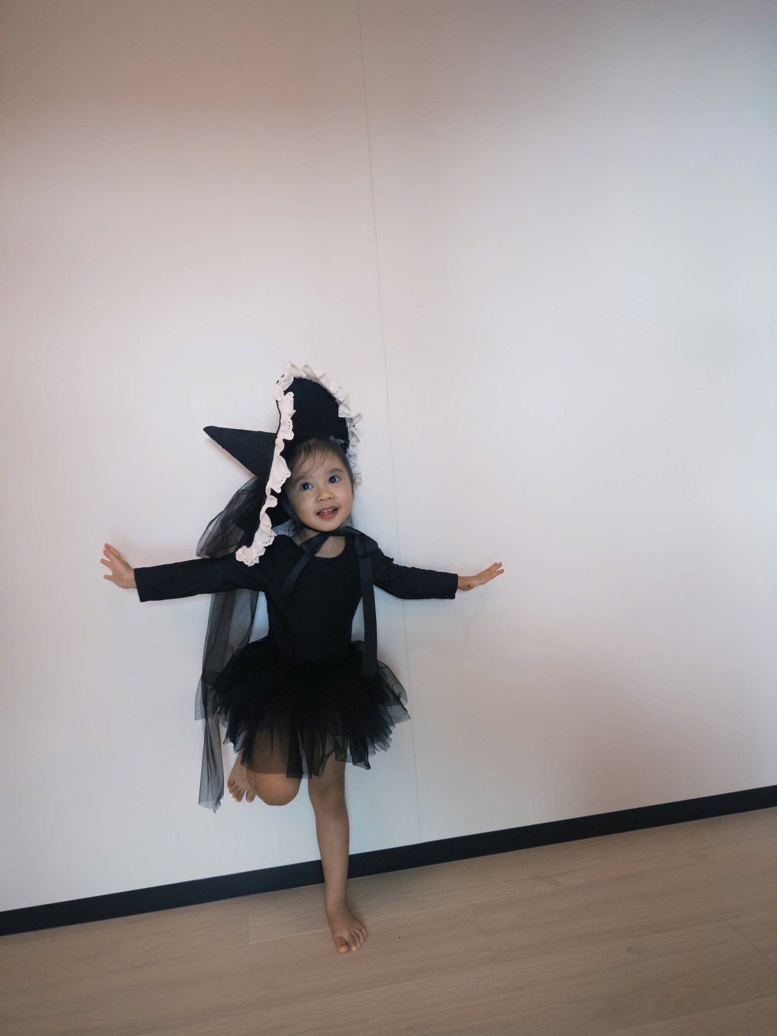Bé Misumi - con gái Bảo Anh đáng yêu khi diện đồ hóa trang. Nữ ca sĩ chia sẻ thêm: "Mà mí tôi đặt giày nhưng shop không giao nên sáng nay tôi đi chân không nha mọi người".