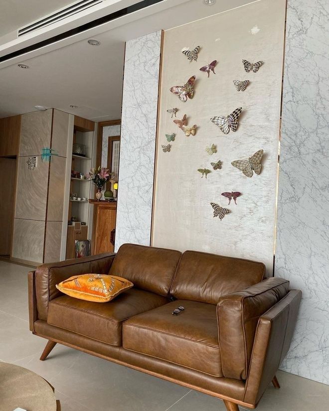 Trong những góc của căn nhà thì Hoa hậu Thu Hoài tâm đắc nhất với chiếc sofa vintage. Phía tường sau sofa được trang trí thêm những cánh bướm mang đến vẻ bắt mắt, thiên nhiên. Nhà rộng nên nàng hậu thường xuyên rủ bạn bè về nhà mở tiệc riêng.