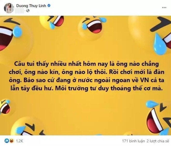 MC Dương Thùy Linh cũng có chia sẻ suy nghĩ trên trang cá nhân. Cô viết: “Câu tui thấy nhiều nhất hôm nay là 'ông nào chẳng chơi', 'ông nào kín, ông nào lộ thôi', rồi 'chơi mới là đàn ông. Bảo sao cứ đang ở nước ngoài ngoan về Việt Nam cả ta lẫn tây đều hư. Môi trường tư duy thoáng thế cơ mà”. Ngoài ra, cô còn bày tỏ nhiều quan điểm về lối sống, đạo đức… của đàn ông dưới bài viết.