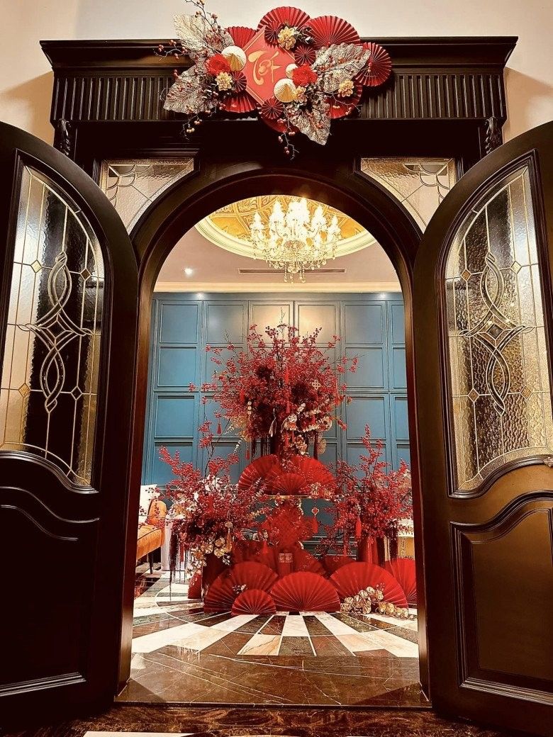 Nữ đại gia quận 7 trang hoàng nhà cửa đón Tết từ rất sớm khi cách Tết tới nửa tháng. Xét về độ đầu tư, có lẽ hiếm ai vượt mặt được gia đình Đoàn Di Băng, dù đây chỉ là căn nhà ở tạm vài tháng của cô. Từ cổng vào trong nhà, đâu đâu cũng ngập tràn sắc đỏ bởi đèn lồng, quạt giấy, cành đào đông,…