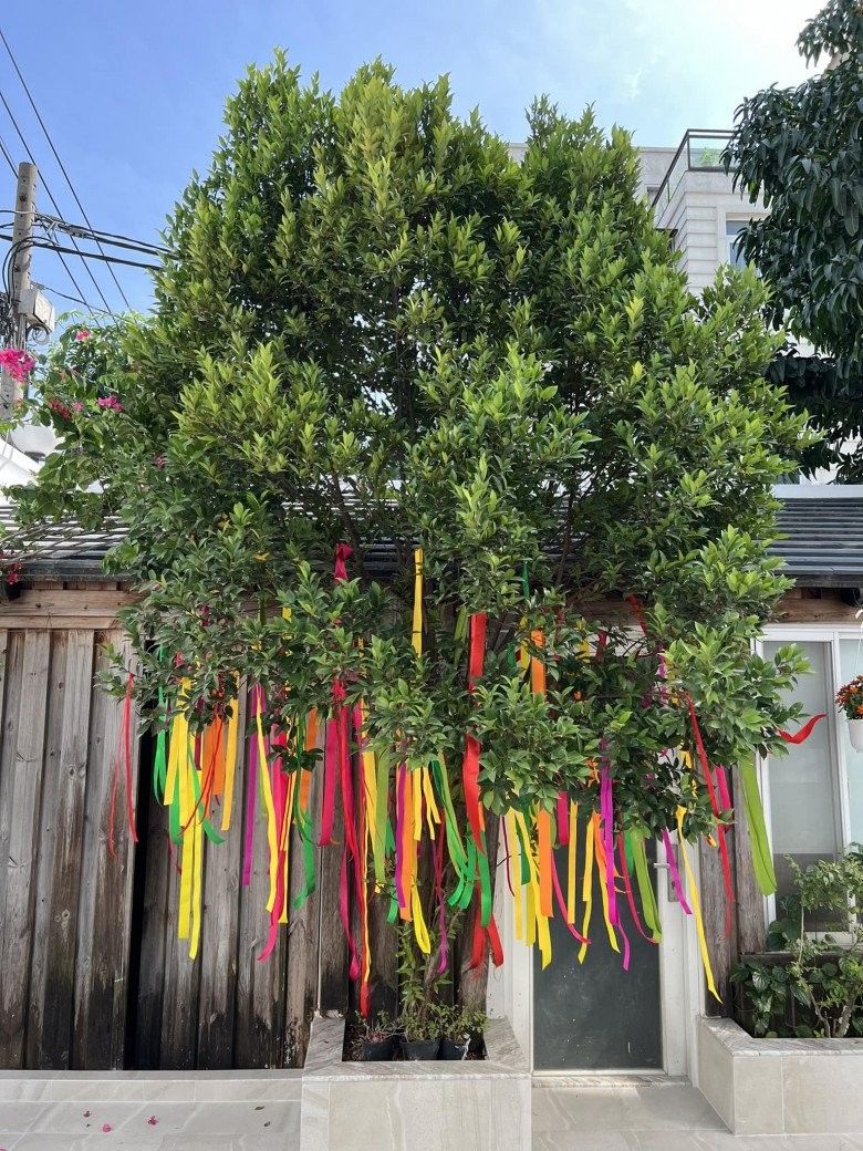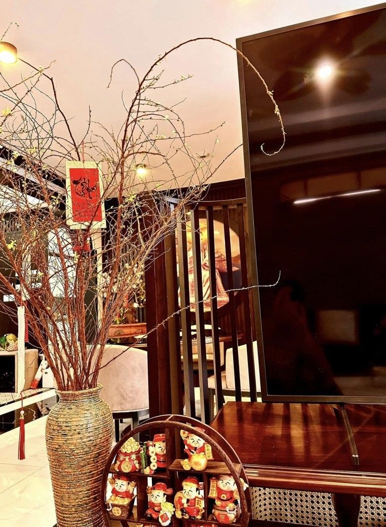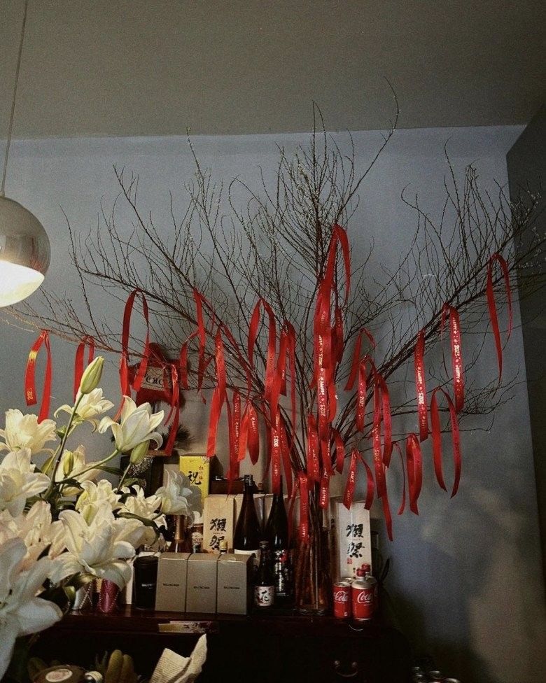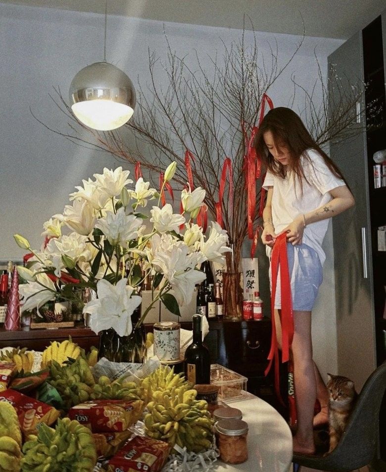 Không gian sống của cô đậm không khí Tết cổ truyền với những loại cây cảnh không thể thiếu trong ngày Tết như đào, hoa ly, thanh liễu, tuyết mãi,… Chính tay cô cũng tự mình trang trí cành đào bằng những dải lụa đỏ, khá lạ nhưng lại rất bắt mắt, sang chảnh.