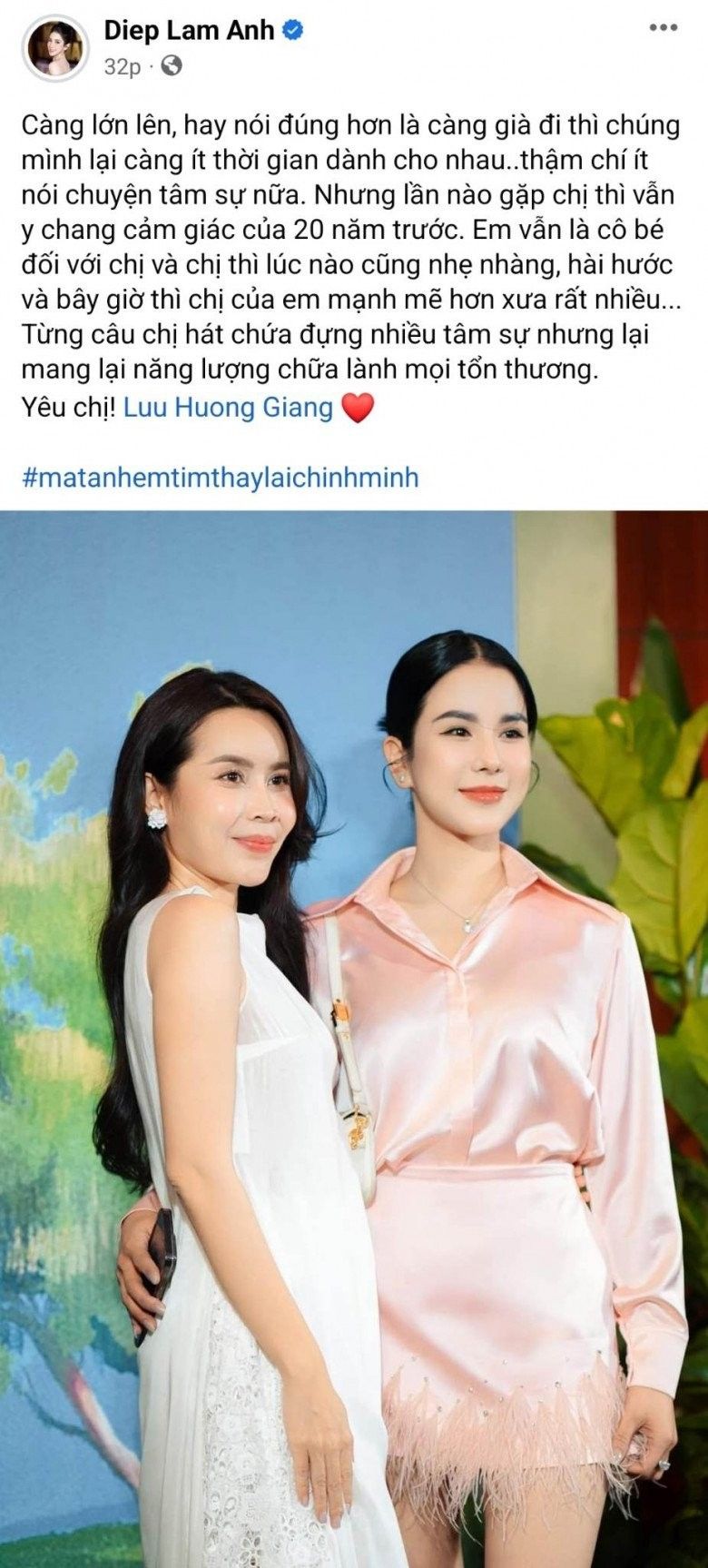Cụ thể, Diệp Lâm Anh viết: "Càng lớn lên, hay nói đúng hơn là càng già đi thì chúng mình lại càng ít thời gian dành cho nhau. Thậm chí ít nói chuyện tâm sự nữa. Nhưng lần nào gặp chị thì vẫn y chang cảm giác của 20 năm trước.