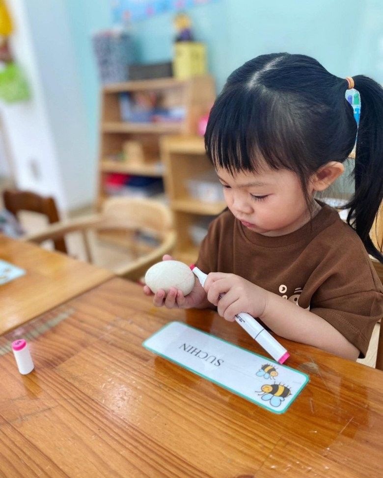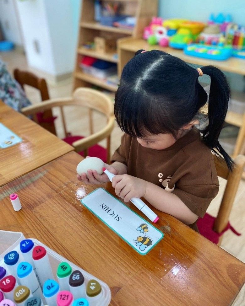 Mỗi bé sẽ có một chiếc bàn riêng được dán tên cố định.