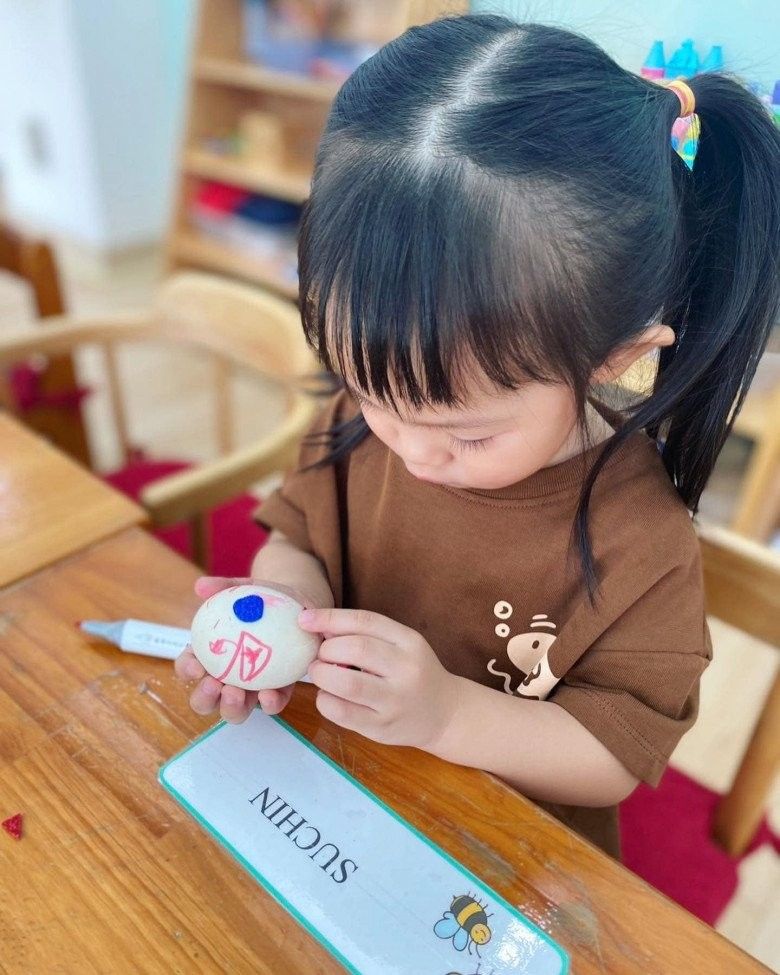 Bé tập dán đồ vật ngộ nghĩnh rất chăm chú.