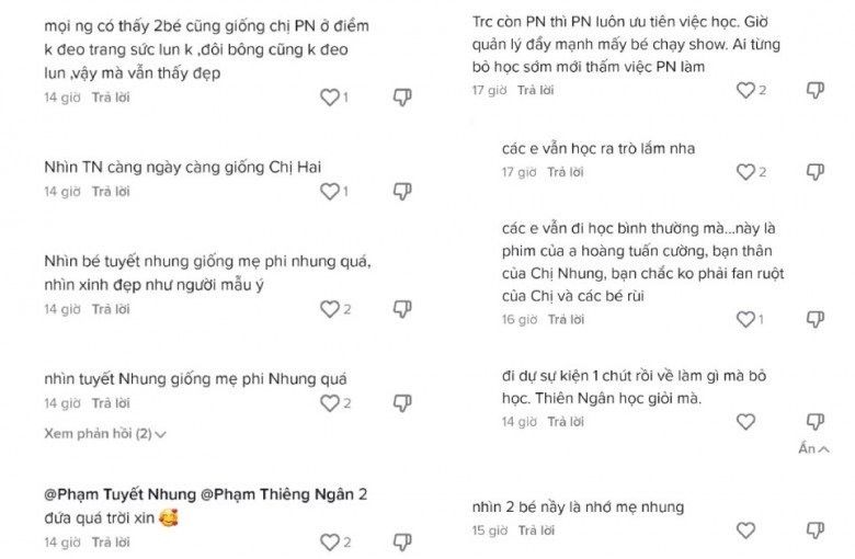 Song song với đó, một vài ý kiến tỏ thái độ không ủng hộ Tuyết Nhung và Thiêng Ngân thay đổi phong cách cũng như hình ảnh trong mắt công chúng. Có bình luận còn chỉ ra rằng khi cố nghệ sĩ Phi Nhung còn sống thì luôn ưu tiên việc học của các con, đến khi cô mất thì con nuôi nào cũng khác, mải mê "chạy show" kiếm tiền: "Trước còn Phi Nhung thì Phi Nhung luôn ưu tiên việc học. Giờ quản lý đẩy mạnh mấy bé chạy show. Ai từng bỏ học sớm mới thấm việc Phi Nhung làm".