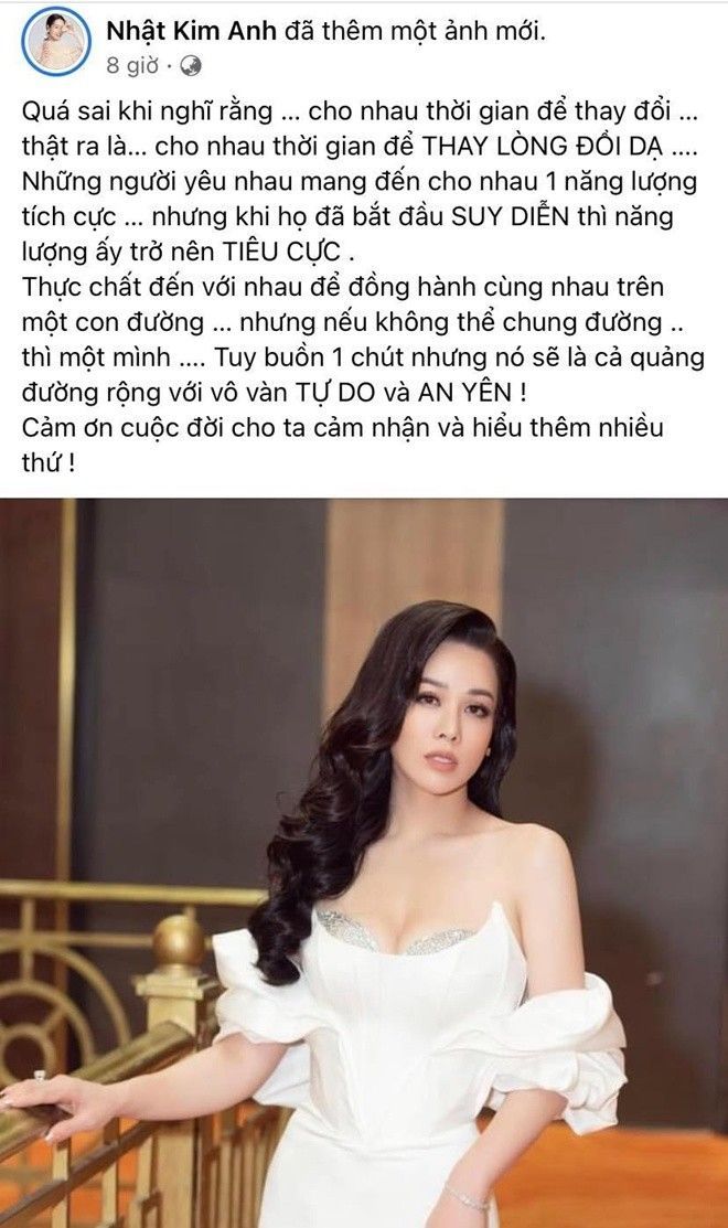 Theo những gì mà Nhật Kim Anh chia sẻ, cô đã dành thời gian để chờ tình mới thay đổi. Tuy nhiên những gì mà cô nhận lại được chỉ là “thay lòng đổi dạ”. Cô thừa nhận bản thân có buồn nhưng đổi lại sẽ có sự tự do, an yên. Những dòng tâm sự này của nữ diễn viên nhận được nhiều sự đồng cảm của cư dân mạng.