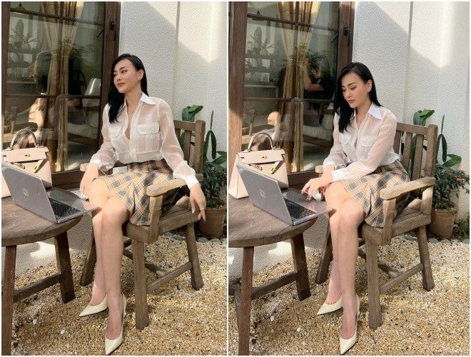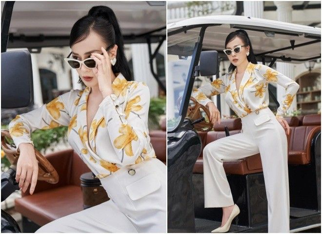 Phương Oanh ngày càng tối giản về màu sắc và form dáng trang phục. Áo sơ mi cách điệu cùng quần ôm là combo "đúng chuẩn" nữ tổng tài hiện đại, thời thượng.
